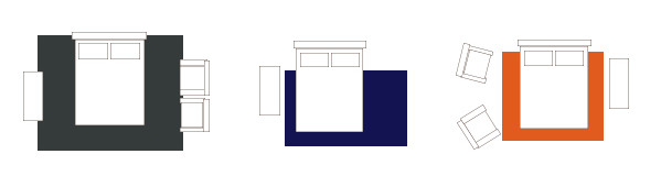 Choose an area rug that is 18 – 24 inches larger than the sides of the bed to give yourself a soft surface to land on. If you have nightstands, measure the distance from the outer edge of both nightstands to use as the width for your guide. When determining the length of the rug, account for furniture at the foot of the bed; all legs should either fit on or off the rug.