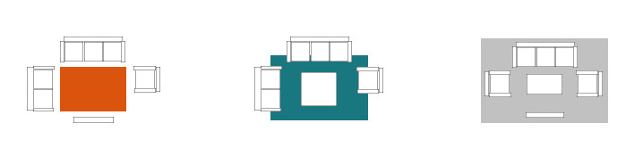 In a living room, a rug should be centered under your coffee table and chosen with the furniture arrangement in mind. Living room seating can be positioned in a number of ways: with four legs on the rug, with four legs off of the rug, or with only the front two legs on the rug. Good design dictates a uniform choice, so if only the front legs of your sofa rest on the area rug, the same should go for the armchair, too. Typically, living area rugs are 5 x 8, 8 x 10, or 9 x 12 feet. If you are unsure what size to choose, go larger. The rug should be large enough to accommodate all four legs of the table and approximately the same length and width of the furnishings in the space. To accent the furnishings most effectively, leave some flooring between the area rug and the furniture exposed.